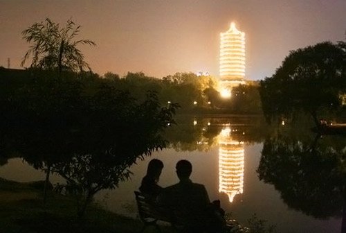 北大校園又稱燕園,包括淑春園、勺園、朗潤園、鏡春園、鳴鶴園、蔚秀園、暢春園、承澤園等,在明清兩代是著名的皇家園林,數百年來,其基本格局與神韻依然存在。校園北與圓明園毗鄰、西與頤和園相望。北大充分利用了這一難得的歷史遺產,營建了風景如畫的校園環境,使之既有皇家園林的宏偉氣度,又有江南山水的秀麗特色。這里不僅有亭臺樓閣等古典建筑,而且山環水抱,湖泊相連,堤島穿插,風景宜人;校園內古木參天,綠樹成蔭,四季常青,鳥語花香,園林景色步移景異。優美典雅的環境內充滿著豐富多彩、魅力無窮的校園生活,使學生可以同時感受到自然的風景和濃厚的人文氣息。美麗的湖光塔影伴隨著大師的背影,這正是燕園中最美的圖畫。著名的“一塔湖圖”指的就是未名湖湖畔的景色。是對北京大學校園內三個著名地點的概括,即博雅塔、未名湖和北京大學圖書館。有人說,博雅塔是一枝碩大的神來之筆,而未名湖則是一方來自天池的巨硯,一代又一代的北大人揮動著這枝神筆,飽蘸未名之墨,共同書寫了百年北大的輝煌歷史,而圖書館則正好是北大百年歷史的最好見證和保存者……從沙灘到燕園,從紅樓到未名湖,百年北大伴隨著風雨而前行。北大人那驚天動地的宏偉業績與默默沉潛的學術思索,共同匯聚成一種可歌可泣的壯與美,凝鑄一段夢魂牽繞的不滅的記憶。秉承著這圣地的精神魅力,每一位北大人都深深地知道,于今日之北大與中國,“北大人”這個名字不僅昭示著一種榮耀,更提醒著一種責任。