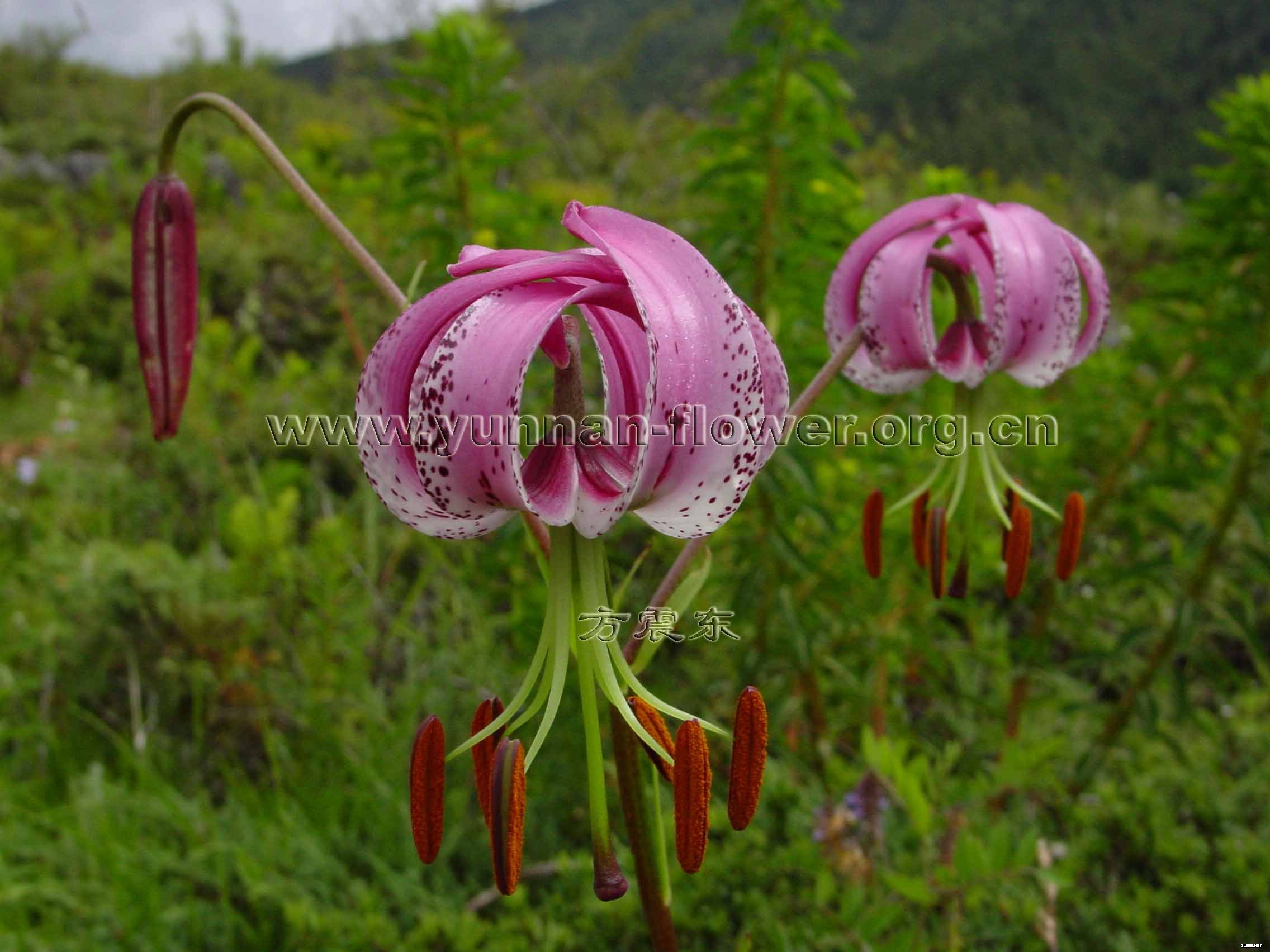 寶興百合Lilium duchartrei Franch. 百合科 百合屬,多年生草本,高50cm~150cm。鱗莖卵圓形,高1.5cm~3cm,寬1.5cm~4cm,具走莖。莖具淡紫色條紋。葉散生,披針形至長圓狀披針形,長4.5cm~5cm,頂端漸尖,基部楔形,全緣,有的邊緣有乳頭狀突起,平行脈3~5,粗糙;無葉柄。花單生或數朵排成頂生總狀花序或近傘房花序;苞片葉狀,披針形,長2.5cm~4cm;花梗長10cm~22cm;花下垂,有香味,白色或粉紅色,有紫色斑點;花被片6,長圓形或線狀披針形,長4.5cm~6cm,蜜腺兩邊具乳頭狀突起;雄蕊6,花絲長約3.5cm,花藥窄矩圓形,長約1cm,黃色;子房圓柱形,長約1.2cm,花柱長為子房的2倍或更長,柱頭膨大,3裂。蒴果橢圓形,長2.5cm~3cm;種子多數,具翅。