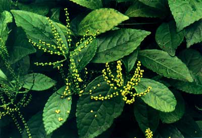 老株基部稍木質(zhì)化,莖直立稍披散狀,莖節(jié)明顯,節(jié)上具分枝。葉對生,橢圓形,邊緣有鈍鋸齒,葉面光滑稍呈泡皺狀。穗狀花序頂生。花黃色,有濃郁幽香。花期8-10月。