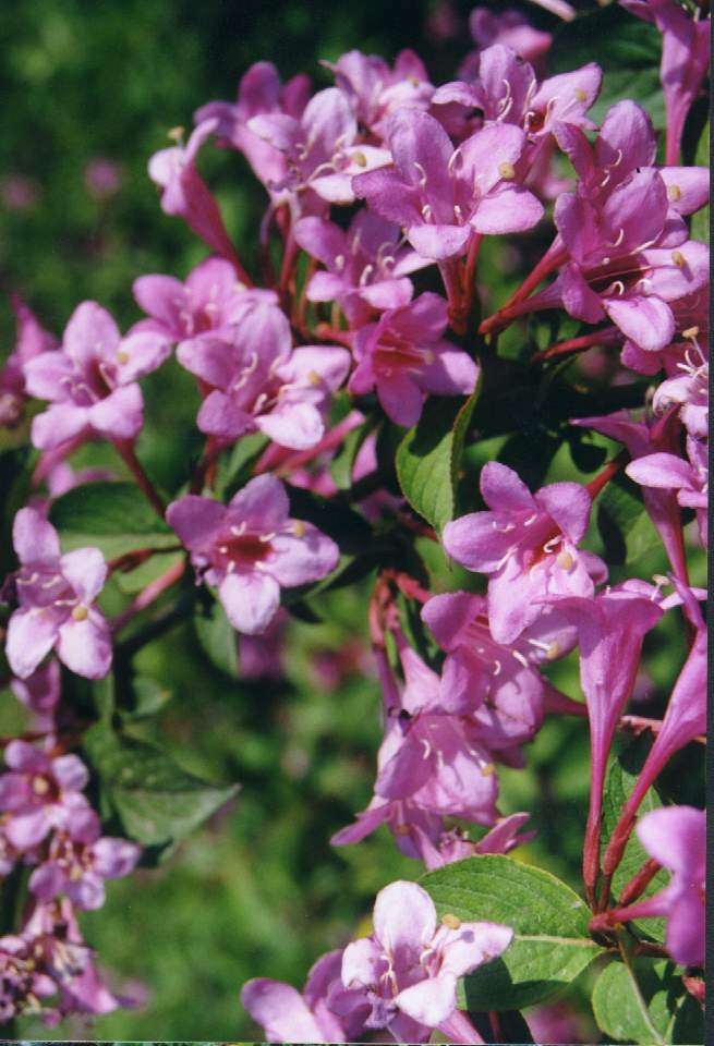 枝條開展,幼枝有兩行柔毛。葉對生,柄短或近無柄,葉橢圓形或卵狀披針形,先端漸尖,基部圓形或楔形,邊緣有鋸齒,葉面脈上有毛,葉背有柔毛,脈上尤密。5~6月開漏斗狀鐘形花,花外面http://www.cnefs.com'>玫瑰紅色,里面較淡,1~4朵組成聚傘花序,腋生。蒴果柱狀,光滑,果熟10月。種子無翅。