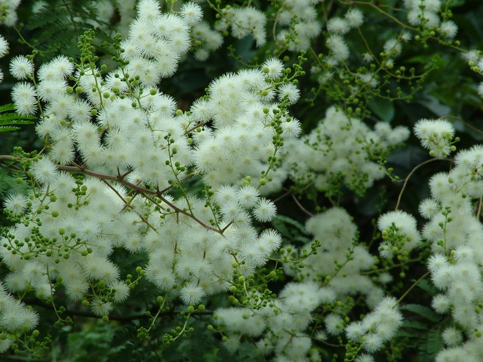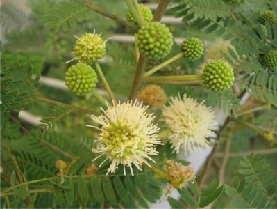 新銀合歡是多年生喬木。植株高大,枝葉多,株高3~5米,最高10米左右,莖粗約10厘米,也有達25厘米以上的。樹皮灰黃色。主根發達,葉為偶數二回羽狀復葉,有羽片5~7對,每羽片有小葉10"-'17對,并有腺點,IJ,,f長1.5厘米,寬0.4厘米,葉面綠色較深,葉背較淺。頭狀花序,白色。莢果扁平,帶狀,內含種子15~25粒。種子扁平,瓜子狀,堅實光滑,褐色,千粒重50克。