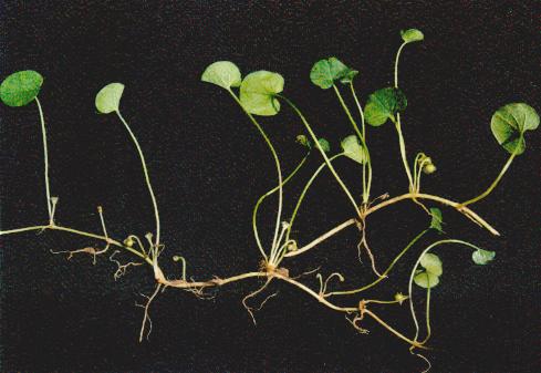 馬蹄金屬于多年生雙子葉草本植物。它植株低矮,須根發達,具較多的匍匐莖,能節間著地生根,全株僅高5~15厘米。葉片扁平,基生于根部,具細長葉柄,腎形,外形大小不等,表面無毛,直徑1~3厘米。夏秋開花,雖有種子,但結實率不高。?