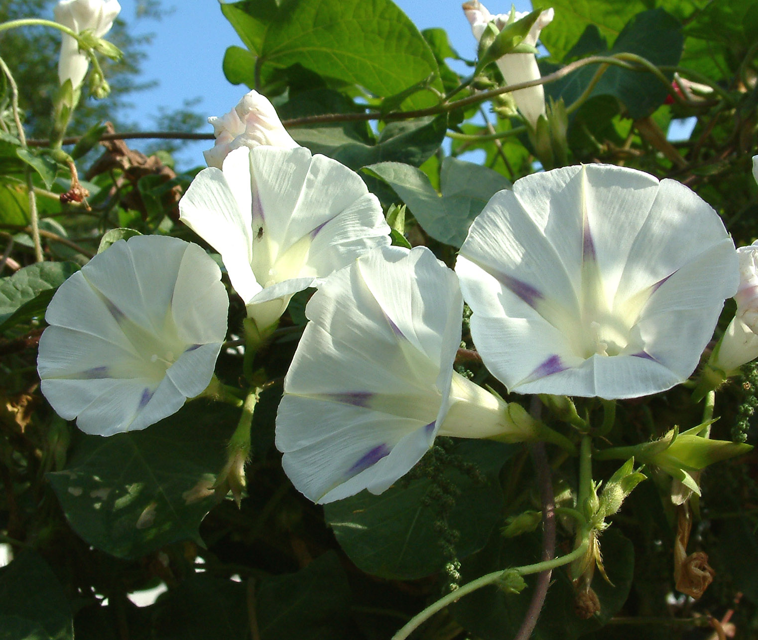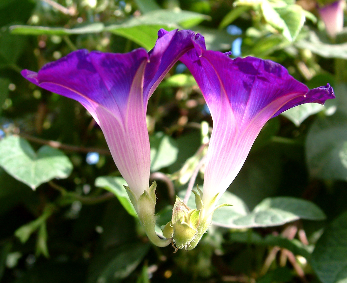 一年生纏繞草本,全株密被白色長毛。葉互生,闊心形,全緣;葉柄與總花梗近等長。花序有花1~3朵;萼片5深裂,裂片卵狀披針形,長約1cm,先端尾尖;花冠白色、藍紫色或紫紅色,漏斗狀,長5~8cm;雄蕊5;子房3室。蒴果球形。種子5~6粒,卵形,黑色或淡黃白色。