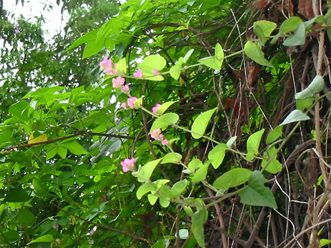 由肥厚的塊根發(fā)出,高達(dá)10米,有卷須。葉對(duì)生,卵形至矩圓狀卵形,長(zhǎng)6-14厘米,先端漸尖,基部深心臟形,由明顯的網(wǎng)脈,兩面近禿凈??偁罨ㄐ蝽斏蛏谏喜咳~腋內(nèi),花多數(shù),淡紅色,有時(shí)白色,長(zhǎng)8-10毫米,叢生,花被裂片宿存。瘦果圓錐狀,上部三棱形,長(zhǎng)約10毫米。