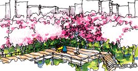 桃花溪是一條城市內河,曾經如它的名字一樣,它是清澈的。迷人的。然而,隨著城市的發展。它變得污濁。昔日風采不再。城市的發展更需要還原它本來的風貌。因此需要對它進行全面的治理。我們將從景觀上賦予它新的生命力。首先,它的功能應當是一條彌漫自然人文氣息的城市生活走廊散發著中國文化清香的桃花將不可避免的成為這條廊道的背景,桃樹下、水岸邊的設施卻更精巧地定義它的功能。寧靜與熱鬧是城市兼具的兩種優良品質,我們設計的桃花溪兼顧二者.在桃花溪修長的區域內。靜區與動區相互交替。桃花溪是寧靜的。城市是喧鬧的。而溪邊的城市生活是愜意的。