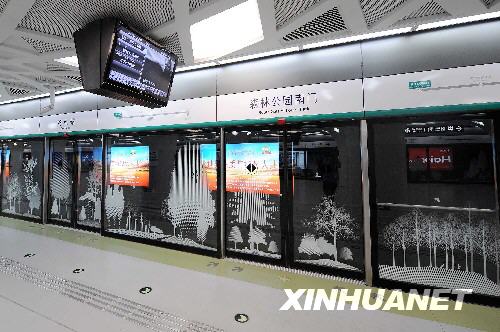 地鐵奧運支線森林公園南門站內的玻璃墻體上噴涂著各種樹木的圖案,候車人宛如停留在大自然中(7月29日攝)。 新華社記者鄒崢攝