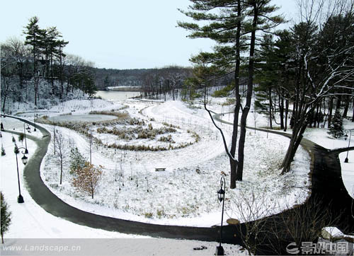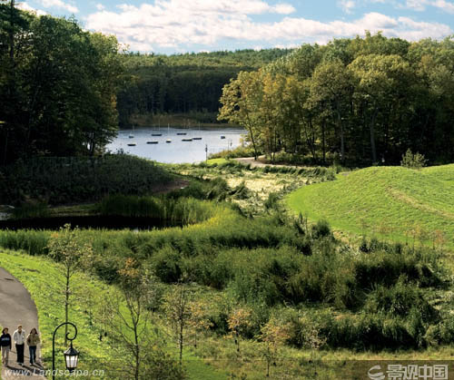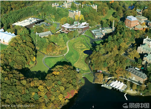 美國威爾斯利女子學(xué)院校友谷景觀再造工程占地13.5公頃,歷時(shí)七年。該地區(qū)歷史上曾受到污染,景觀復(fù)原的目的就是通過補(bǔ)救性的凈化系統(tǒng)創(chuàng)建具有生態(tài)功能的新景觀。