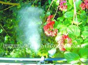 另外一種溫室中常用的降溫系統就是噴霧系統(如圖4),它通常與自然通風系統合用。與風機濕簾系統相比,它可以使溫室冷卻得更為均勻。推薦在溫室內間距5至10平方米安裝1個噴頭,水壓要足夠高(大于500psi),這樣可以使水珠更為細密,在水珠達到葉片之前就霧化了,有利于吸收更多的潛熱。為了防止噴嘴堵塞,水中不應有任何雜質,所以需要進行水處理(過濾和凈化)和安裝高壓泵。此外噴嘴的質量要求比較高,以經受得住水的高壓,因此噴霧系統的成本要比風機濕簾高。相對于風機濕簾系統,噴霧系統的噪音比較小,對于溫室內的工人或參觀者來說都比較有利。