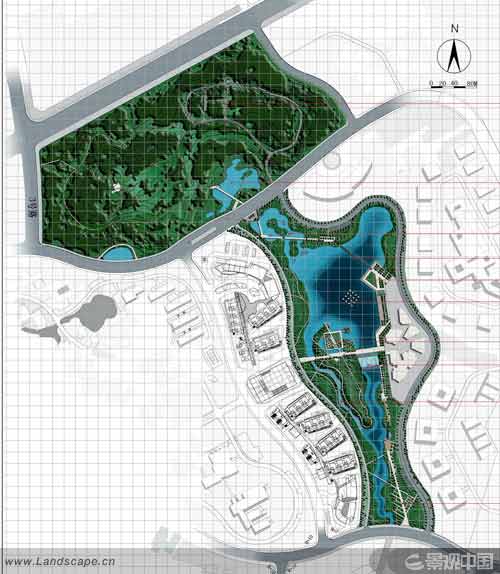綜合分析了在中心景區設計中所要必須考慮的文脈因素后,根據功能要求和地形特點,我們對總體布局做了系統性的構思。整個中心景區的景觀構架概括為:一山,一水,兩通道道。