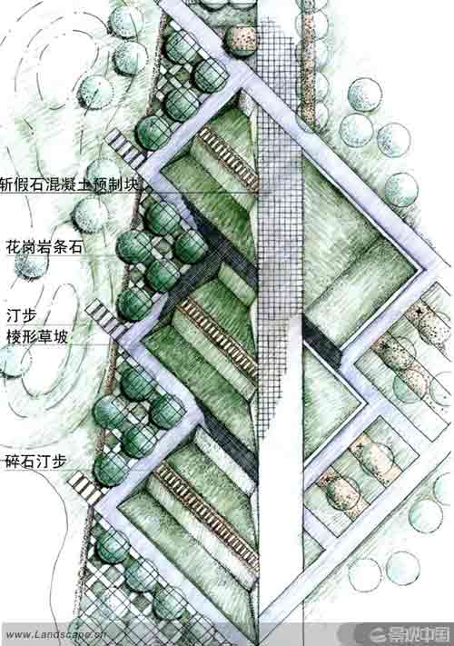 在軟件園中心景區的設計中,在綜合分析了項目自身的地域特征和行業特點,在總體設計意向和手法上,我們認為,必須對之后項目本身有深刻內在關聯的文脈層面的文化特征,予以適度的保留和延續,在意向層面上消融與弱化相互沖突及難以統一的表層特征。用隱喻的后現代手法,凸現出簡約與沉穩的景觀基調,在現實與歷史文脈之間,不是像西方設計師設計央視大樓那樣,采用“割斷”的手法,而是持融匯交合的手法。