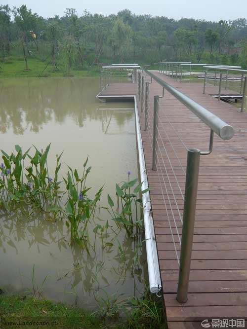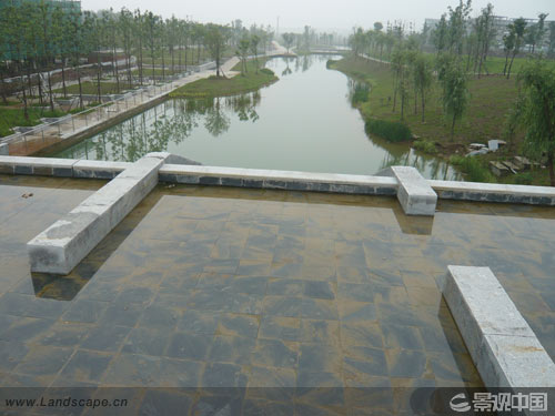 利用現狀水系,將原有王莊水庫和軟件園南側的排洪河道相連接,構建中心區景觀。人行步道沿水岸線布置,根據功能的不同,不斷變換著景觀語言,入口,廣場,木棧道,橋,踏步,平臺,滾水壩交替出現。水既是聯系不同功能板塊的紐帶,又是景觀視線的匯集點。