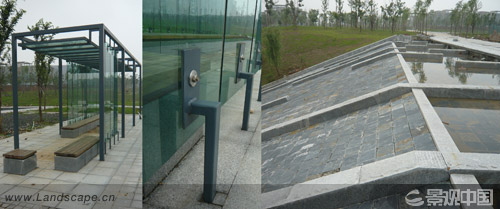 硬質材料,主要是石材、鋼材和玻璃的運用:一是地面鋪裝和豎向園建;二是橋體、護攔和廊亭;三是相關設施。軟質材料,主要是植物的運用,見本文5.1.4;中性材料,主要是木質材質的運用,如平臺、木棧道、座凳的坐板,以增加空間的親和性;動感的材料,如滾水、噴泉。