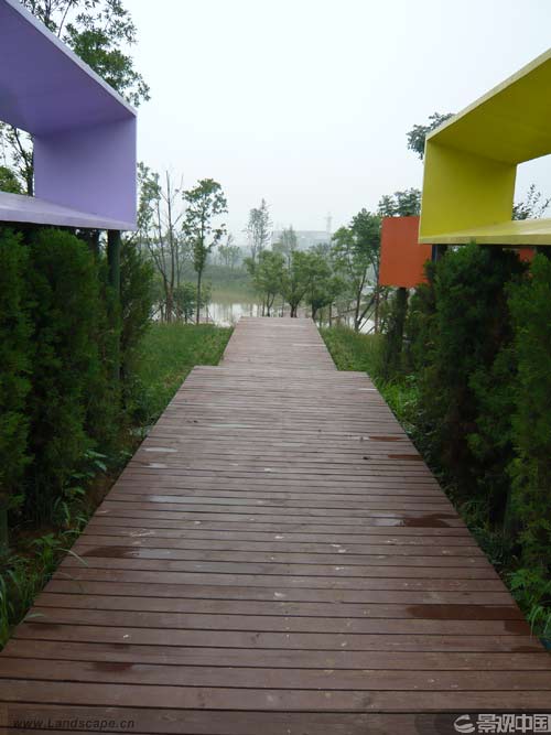 一條筆直的人行路,從擋水壩下的半島起始,跨越星光大道,切入休閑廣場,然后伸向水中,連接住漂浮在水面上的一個平臺。在路與休閑廣場的中心部位,設計了一個由深灰色鋼架和綠色懸掛玻璃組合的廊亭。玻璃廊亭平行與直線的路軸,與傾斜的草坡上的現代雕塑遙相互應,共同朝向湖水。廊亭懸掛的玻璃呈均衡布置,視線通透,造型簡潔,與周邊的樹陣、鋪裝、碎石、草坡協調有致,又個性鮮明,在平和中透出一種內斂的張力。