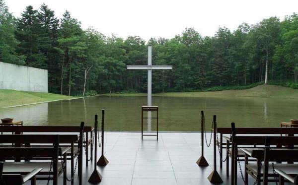 水的教堂位于北海道夕張山脈東北部群山環抱之中的一塊平地上。從每年的12月到來年4月這里都覆蓋著雪,這是一塊美麗的白色的開闊地。安藤忠雄和他的助手們在場里挖出了一個90m×45m的人工水池,從周圍的一條河中引來了水。水池的深度是經過精心設計的,以使水面能微妙地表現出風的存在,甚至一陣小風都能興起漣漪。