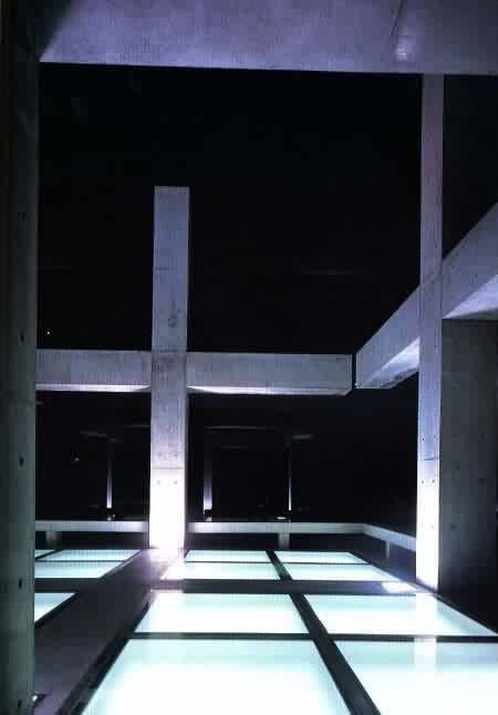 在一系列教堂的設計中,安藤忠雄思考著神圣空間。他問自己,對他來說神圣空間意味著什么?在西方,神圣空間是形而上的。然而,他深信神圣空間與自然存在著某種聯系,而這與日本式的泛靈論或泛神論無關。他思想中的自然是與原生的自然不同的。對他而言,神圣所關系的是一種人造自然或建筑化的自然。他認為,當綠化、水、光和風根據人的意念從原生的自然中抽象出來,它們即趨向了神性。后來建造中的光的教堂表現的是光這種自然元素的建筑化和抽象化。空間幾乎完全被堅實的混凝土墻所圍合。內部是真正的黑暗。在那樣的黑暗中飄浮著一道十字架的光線,這就是全部。墻上的裂 賦與空間以張力并使之神化,它們抽象地渲染著已經建筑化了的室外光線。