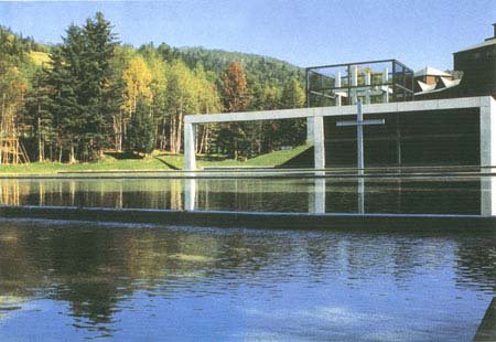 面對池塘,設計將兩個分別為10m方和15m見方的正方形在平面上進行了疊合。環繞它們的是一道“L”型的獨立的混凝土墻。人們在這道長長的墻的外面行走是看不見水池的。只有在墻盡頭的開口處轉過180°,參觀者才第一次看到水面。在這樣的視景中,人們走過一條舒緩的坡道來道四面以玻璃圍合的入口。這是一個光的盒子,天穹下矗立著四個獨立的十字架。玻璃襯托著藍天使人冥思禪意。整個空間中充溢著自然的光線,使人感受到宗教禮儀的肅穆。接著,人們從這里走下一個旋轉的黑暗樓梯來到教堂。水池在眼前展開,中間是一個十字架。一條簡單的線分開了大地和天空、世俗和神明。教堂面向水池的玻璃面是可以整個開啟的,人們可以直接與自然接觸,聽到樹葉的沙沙聲、水波的聲響和鳥兒的鳴唱。天籟之聲使整個場所顯得更加寂靜。在與大自然的融合中,人們面對著自我。背景中的景致隨著時間的轉逝而無常變幻。