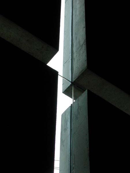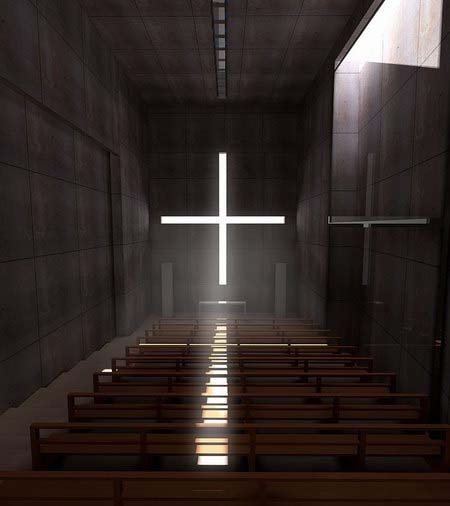 設計的重點轉移到內部。空間以堅實的混凝土墻所圍合,創造出絕對黑暗空間,陽光從墻體上留出的垂直和水平方向的開口滲透進來,從而形成著名的“光的十字架”??抽象、洗練和誠實的空間純粹性,達成對神性的完全臣服。沉溺于安藤神話的想象與懺悔,置身其中渾然不覺時間的流逝。