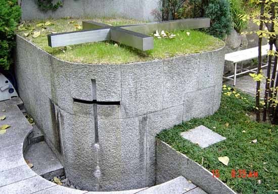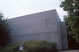這一建筑雖然形體簡單,但卻蘊含了一種復雜而極其優秀的建筑處理,這片成角度插入的素混凝土壁體,以最簡單的方式解決了基地和工程所有難題。由于靠近道中路,因而除了面向內院和西壁體,其于墻面在開窗是合適的。這片斜墻不僅分割了空間,而且把柔和陽光反射滲透進教堂室內,掩蔽了現存內院中的牧師住宅,并隔離了喧囂的外部世界。