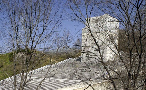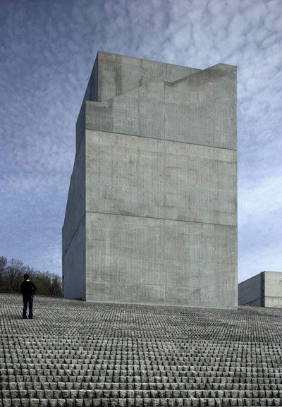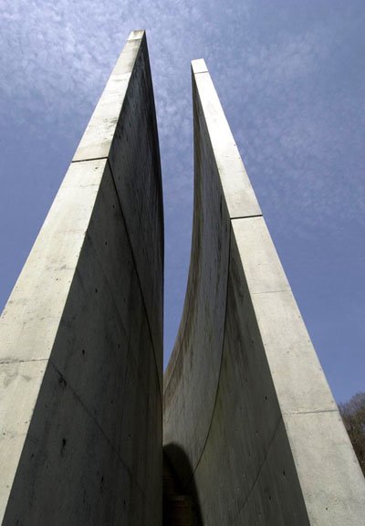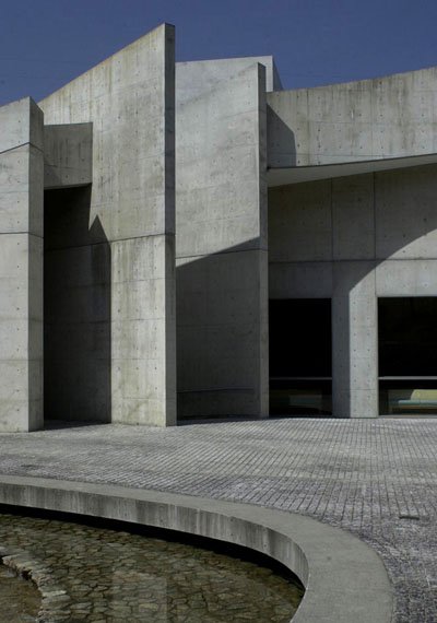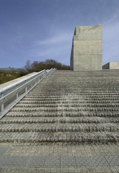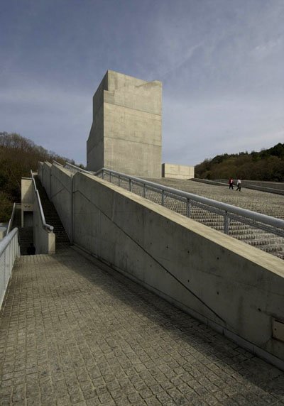 日本大阪飛鳥博物館(Historical Museum,Osaka,Japan,1994)位于大阪一處古墓冢眾多的山林之中。為了盡量減少對已有環境構成的干擾,博物館大部分形體隱埋于地下,而且使得參觀者能夠真切地感受到古代時期的風俗和祭祀觀念。安藤采用抽象簡潔的大臺階與景觀塔為參觀者提供觀賞周圍環境全景的場所。兩者作為室外空間制高點形成對比,具有強烈的紀念性效果。博物館室內具有典型古王陵風格"鎖孔形"展示空間暗示出遺址的存在。