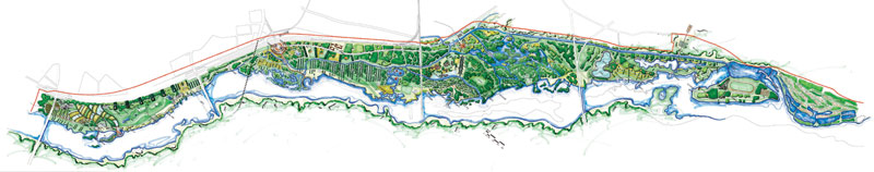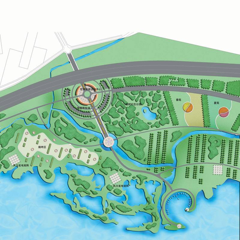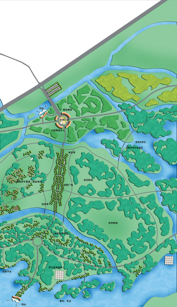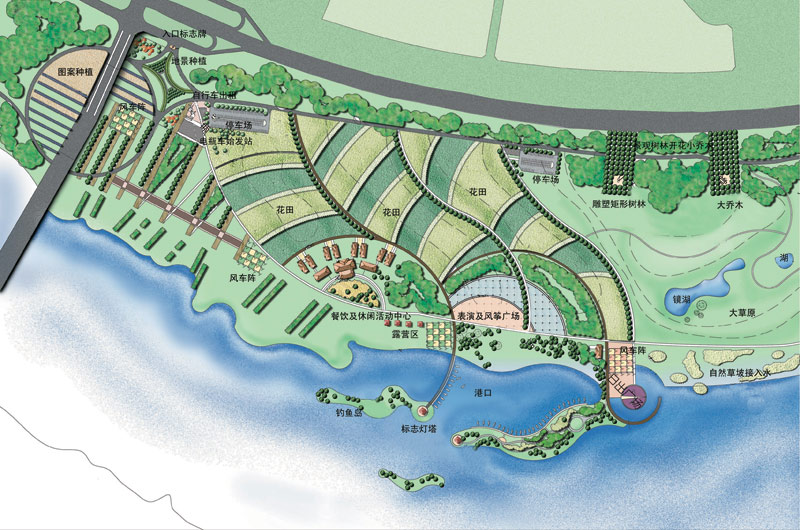 總體設計說明:渾河是流經沈陽市的最大的一條河流,其中流經沈陽規劃區段為57km,規劃水面平均寬度為400m,水面兩側為綠化帶,公園規劃面積約14km2。本案以“歡樂水濱,純凈自然”為規劃設計的主要目標;定位是:以生態景觀為主的綜合性城市森林公園,以郊野風情和健康旅游作為吸引游客的主要旅游特色。