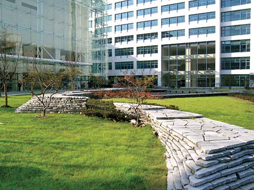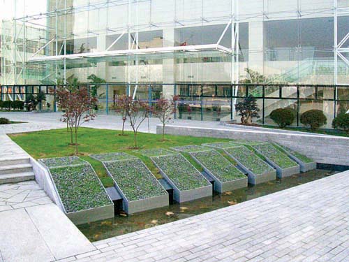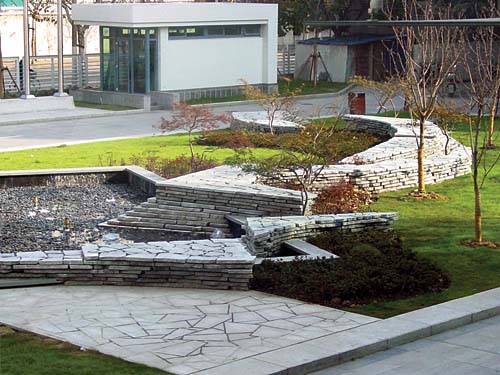 工程簡介:上海市國資委黨校新建校區(qū)位于梅隴路。追求工業(yè)與生態(tài)環(huán)境的協(xié)調(diào)發(fā)展,為該景觀營造之主旨。正門廣場在大草坪上堆砌不規(guī)則花崗巖石板,形成大小不一、形態(tài)各異的扇型梯狀結(jié)構(gòu),著力展示石材所具有的天然雕塑般的魅力。草坪右側(cè)水池上的一排石板梯型箱狀結(jié)構(gòu),以十分規(guī)則的造型作為主景的烘托。廣場右側(cè)的庭院景觀采用鋼筋框內(nèi)壘石成墻,在水池邊施以綠化和景觀石,其間的石板小道及休閑矮凳,營造人性化的環(huán)境。整個景觀充滿了現(xiàn)代人文氣息。