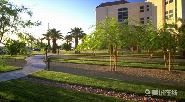 圣羅斯旗艦醫院隸屬圣羅斯多明教會醫院,位于拉斯維加斯西南部的內華達州的亨德森市。設計師將該醫院設計的具有非常濃厚的好客氛圍。在醫院主大樓的兩翼并排栽種了兩列長長的棕櫚樹,作為入口走廊。設計使用了大量的沙漠與抗旱植物,如標示入口的棕櫚樹、裝飾草坪與苔蘚等。