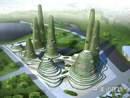 各個(gè)建筑的多樣性就是要求各自具有不同的程序、選址和規(guī)模,為了達(dá)到這樣的要求,設(shè)計(jì)師們將所有的建筑都設(shè)計(jì)為環(huán)形,通過(guò)將這些環(huán)形向外架構(gòu),每一層都設(shè)計(jì)了一個(gè)露臺(tái)。在層與層間安裝了水循環(huán)系統(tǒng)用來(lái)儲(chǔ)水和灌溉露臺(tái)上的植物,這些山狀建筑的樓頂和天臺(tái)的圍合式籬笆墻里面種植了各種植物,形成一個(gè)易辨認(rèn)的附屬花園。這些垂直花園改善了建筑的氣候條件和通風(fēng)滬指那個(gè)框,降低了能源和水的消耗,因此,這些綠色的小山也就自然的形成了一種獨(dú)特的景觀。