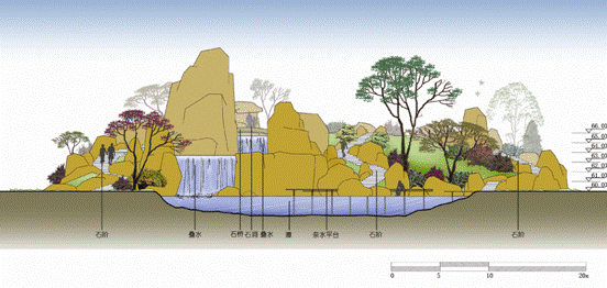 “林泉高致”疊瀑位于主山的西南余脈,該景區(qū)環(huán)境相對封閉,以山體自然形成的谷地設(shè)計(jì)而成的一條溪澗瀑布,從西向東匯入人工湖中,構(gòu)成山水相依的空間格局。山頂設(shè)飛瀑,蜿蜒而下,直匯主湖,林蔭小徑在溪流上穿行,林泉相映成趣。圍繞小溪設(shè)計(jì)一系列自然景觀,林蔭小徑在溪流上穿行,形成空間趣味點(diǎn)。從生態(tài)方面考慮,山體雨水自然匯成小溪,最后蓄積在湖中。植物配置從山體的混交風(fēng)景林向草甸、濱水水生植物逐漸過渡,形成自然的植物群落(圖10) 。