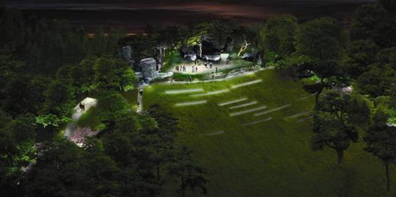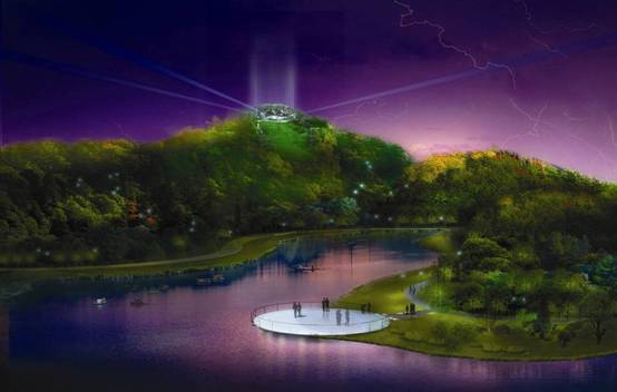 在主軸線上的湖心島設(shè)一濱水平臺,平臺伸入水中,是中軸線在進(jìn)入主山高潮的一個(gè)前奏,也是主湖與主山在景觀序列上的一個(gè)過渡區(qū)域,同時(shí)為游人提供活動(dòng)、觀景的場所。這一景點(diǎn)與主山景區(qū)的天境景點(diǎn)同處中軸線位置,兩者遙相呼應(yīng)。該平臺上承“天境”的雄闊及天人合一的理念,形成一處以圓形為基本造型的匯聚廣場,延伸至水邊。同時(shí)輔以夜間光表演??其主題為渾圓完滿的圓形廣場中光照形成的弧線變化象征月相變化??既有簡練、渾厚、終極的造型,又含悠遠(yuǎn)、縹緲、輕靈的意境(圖9) 。