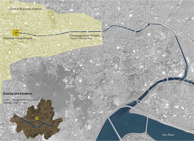 ChonGae運河工程是首爾市政府治理橫穿城市的被污染和覆蓋河道的一部分。設計師在通道中設計了兩個步行區,其他的街區是由當地的景觀設計師設計的。其結果就是創造了一個能將人從車行道引至這個工程的步行街。