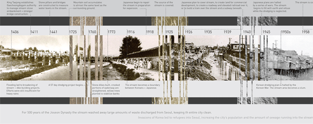 從歷史上說,Chongae河是周圍山脈的流水聚集而成的天然河流。溪流也是首爾在1394年被選為首都的原因之一。河流的戰略性地理位置和周圍環繞的群山使得首爾成為了韓國理想的政治,文化,社會中心。在過去的450年里,生活廢水和工廠污水源源不斷的流入ChonGae河中.隨著首爾越發密集的人口,這個河流變成了這座城市衛生條件極差和貧窮的象征。從1920到1937,在日本占領韓國的時期,這條受到嚴重污染和退化的河流被覆蓋,周圍的臨時住房都被摧毀。在20世紀60年代中期,一條高速公路橫跨這個河流,更加的模糊了河流的地位并分隔了城市。