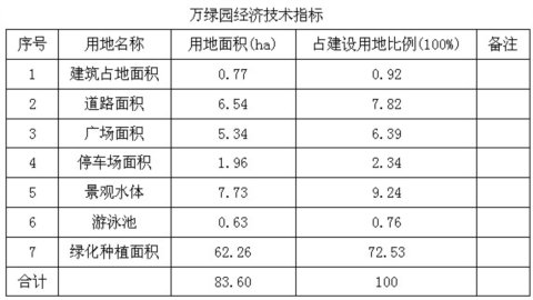 六、技術經濟指標:綠地率:81.77%,容積率:0.013,建筑密度:0.92%。