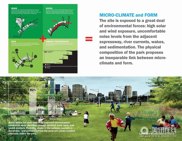 微氣候和外觀。這個地方受到很多環境力的影響:強日照和強風、鄰近高速公路帶來的不舒適噪音度、河流、尾流和河水沉積。公園的微氣候和外觀之間不可分割的聯系是有這些物理因素而引起的。