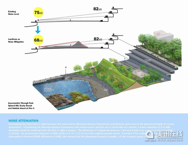 噪音衰減。聲音衰減的普遍原理就是中斷噪聲源(布魯克林區?皇后區高速公路)和聽者(公園游客)之間的直接視線聯系。如果用土丘作為障礙,隔斷布魯克林區?皇后區高速公路和公園之間的視線連接,那么噪音就會減少5至8分貝。每增減1貝爾,都會帶來很大的變化(1分貝等于1/10貝爾)。如果每減少6分貝,那么聲功率也只有最開始的1/4。