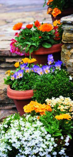 設計師用黃色、橙色、粉色等鮮艷的一年和多年生小盆栽,裝飾臺階的邊界,增加視覺焦點。1橙色金盞花、淺紫色三色堇、黃色和奶油色的龍面花、白色的翠蝶花,簇擁在小路邊,讓低頭拾階而上的過程也能得到美的享受。