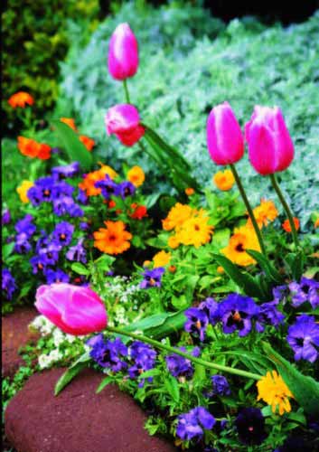 設計師建議大家用自己喜歡的顏色大膽裝飾花園。1還可以增加一些亮色的開花植物讓整個花園效果更精彩。比如將黃色金盞花點綴在粉色郁金香和紫色三色堇花叢中,對比的運用讓整個區域的效果更加突出。