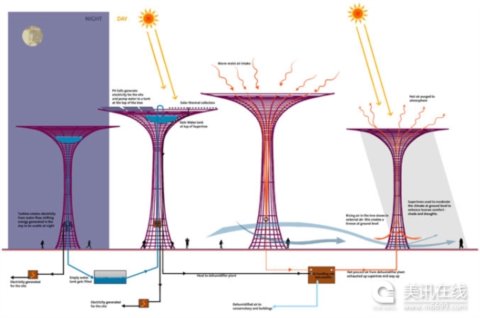 該工程最為引人注目的是超高的樹形結構,這些超級大樹的高度在30-55米之間,外層將纏繞有蕨類植物、攀爬植物和熱帶花卉。這些結構可以作為收集雨水和太陽能的垂直花園,在夜晚起到維持花園和道路照明的作用。
