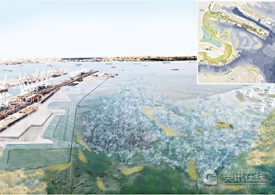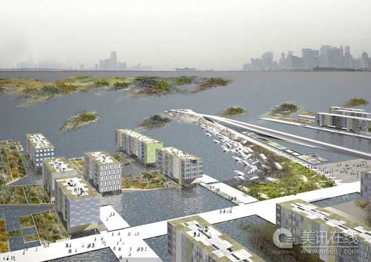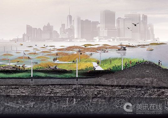 09年11月,這幾個團隊駐扎進P.S.1現代藝術中心??紐約近代美術館在長島市的附屬館。他們的方案非常豐富,其中包括即時有效的設計方案,如在人行道和馬路上安裝管道來轉移水向;還包括一些新鮮的設計方案,如重建高地,水位上漲時,這些高地就變成小島,小島和小島之間通過水路相連。顯然,他們不僅要設計這些解決方案,而且還要想像海平面上升后的紐約是一番什么景象。