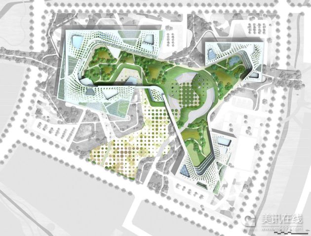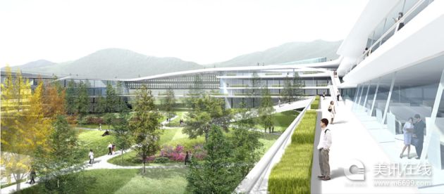 建筑外觀延綿起伏,與地平線平行,讓人聯想到附近的山丘景觀。蜿蜒的綠色屋頂將多個建筑連在一起,形成一個大型的戶外區,項目場地地貌和綠色軸線體現出建筑的有機結構。