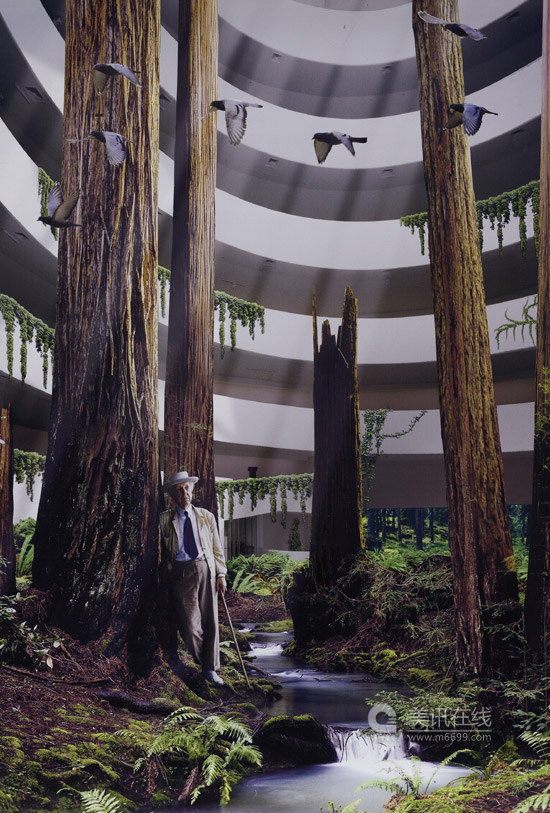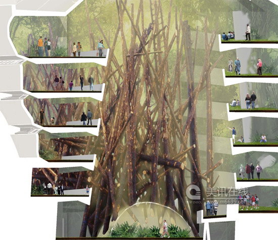 古根海姆博物館不可避免地和野性的自然產(chǎn)生了沖突,未來的古根海姆博物館能否在保持它的建筑之美的同時又增強游客的體驗呢?荷蘭West 8建筑公司希望通過設計一座森林來驗證這個疑問。這個設計包括兩個主要元素:一處長滿苔蘚和蕨類植物的洼地,從第一層一直延續(xù)到頂層――帶狀的室內(nèi)公園。中央庭院中還設計了100根和建筑齊高的圓木,在如此一樣的奇特區(qū)域中,游客們肯定會問:“樹木是從可持續(xù)砍伐林區(qū)中砍下來的嗎?這些植物能這樣的環(huán)境中生存嗎?”也許古根海姆博物館只是一個玻璃盒中的“睡美人”,從沒被自然接觸過。