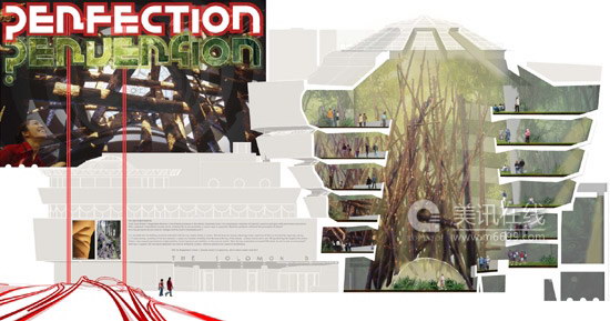 倫敦藝術(shù)家Matthew Ritchie的設計則源自宇宙中的一物――古巴比倫金字形神塔(過去可用來躲避美索不達米亞地區(qū)的洪水)。Matthew Ritchie講金字形神塔和方舟、豐饒角、生物、宇宙、神等聯(lián)系在一起。他的設計中還有一個特點,就是通過HVAC系統(tǒng)可以利用外部空氣調(diào)節(jié)室內(nèi)的氣候區(qū)。