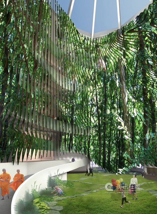 紐約Hariri & Hhariri Architecture建筑公司的“內外”設計則稱贊了弗蘭克?勞埃德?賴特按照自然布局設計了這個博物館。在一封標注1943年7月14日的信上,賴特告訴古根海姆先生,他打算把博物館建造在紐約的Riverdale區,這個博物館將是一個有機的建筑,像公園一般和自然融合在一起,博物館和紐約市的剛性網格布局將截然不同。Hariri & Hhariri Architecture建筑公司正式按照信上所描述的進行設計,他們把圓形庭院設計成一個草木叢生的戶外空間。如果博物館不能置身于自然之中,那么就把自然帶入到博物館內。館內墻壁上每隔一英尺的高度高度就安裝一塊一英寸厚的可回收纖維板,纖維板切割成有機物的外觀,然后兩面都印上綠色植物的團。這些纖維板是一個系統,能讓游客如同置身在公園中一樣。纖維板兩邊都有圖案,因此不論游客是中央庭院中,還是沿坡往上走,都能感受到自然的味道。