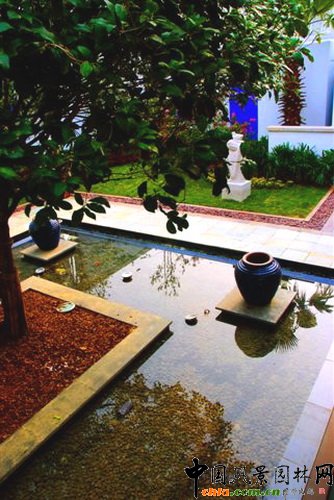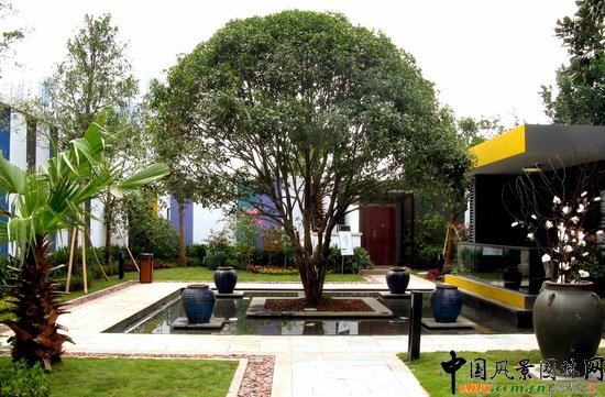 住宅公園整體地塊為一個狹長地帶,設計過程中我們利用規劃時建筑的擺放位置因勢利導,組織交通流線,僅在幾處較為開場的地方設置景觀節點,每一個景觀節點的設置均考慮同時滿足室內和室外兩個欣賞角度,真正將建筑和園林融合成一起。中心最為開場處我們將其設置為整個公園的公共核心景觀區,一顆樹形優美的桂花與靜水面、吐水缽的結合使得整個空間形成明顯的向心性,成為人們集中駐足觀賞的地方。