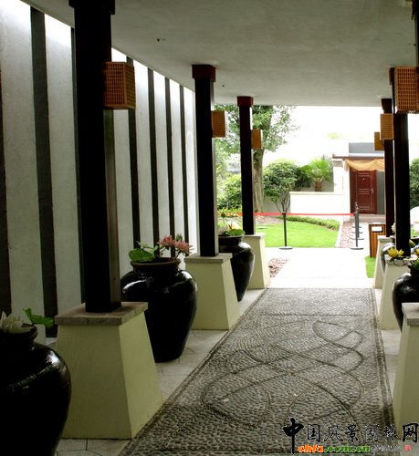 長沙萬科金域藍灣住宅公園(以下簡稱住宅公園)在設計過程中突破了以往的樣板區設計理念,將幾個相對獨立的樣板房散置在一定的區域內,通過圍墻的圍合將周邊環境對其影響降低到最小的程度,同時利用園路的疏導使得人們在看房的同時感受園林帶來的氛圍,讓人們在瀏覽樣板房的同時仿佛置身與花園當中,以此吸引消費者,增強業主購買的決心。為了方便人們的游覽和銷售的需要,設置了兩個出入口,主要出入口位于銷售大廳側面,次要出入口(看房出入口)位于銷售大廳后面。主要出入口在滿足功能的同時擔當了展示的作用,泰式景觀十分注重入口地區的表現,在巴厘島幾乎所有的住宅包括個人的私家住宅在內,所有的入口幾乎都有一對左右呼應高出圍墻的墻垛作為入口的展示部分。因此在金域藍灣住宅公園的入口我們設計了一對較高的雕塑柱配合金域藍灣典型的孔雀雕塑造型,結合水景的處理在小空間尺度的園林中體現了其自身存在的禮儀感,成為鮮明的入口標示。次要出入口處我們利用廊架將室內外相連,利用灰空間自身的特性將室內外融為一體。