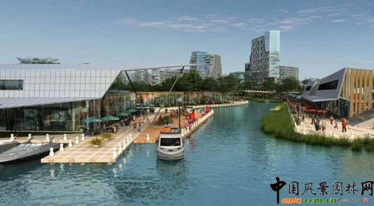 AJ+C 在水路設計方面同ASA建筑事務所一同合作,建造一個脫離京杭運河的人工運河。這個新的人工運河將成為一條主軸線。高樓大廈代表著山,那么高樓與水路相交的區(qū)域就成為了“景觀”。