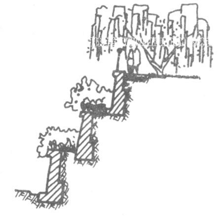 在適宜的位置利用墻體界面做成畫(huà)廊、宣傳欄、廣告欄;擋土墻用自然山石材料,與假山相結(jié)合,擋土墻和假山渾然一體,化實(shí)為虛,得以偽裝。這種設(shè)計(jì),擋土墻和假山的材料種類一定要一致,否則會(huì)感到不協(xié)調(diào);擋土墻與臺(tái)階、花壇、座椅相結(jié)合;利用地勢(shì)差將擋土墻設(shè)計(jì)成疊泉、壁泉,形成動(dòng)態(tài)景觀。以上設(shè)計(jì)非常巧妙,既節(jié)省空間,減少費(fèi)用,又有很強(qiáng)烈的觀賞性和功能性,分散了人們對(duì)墻體的注意力,產(chǎn)生和諧的親切感。