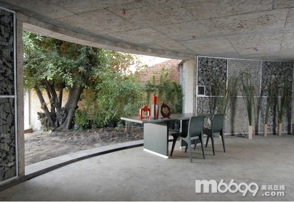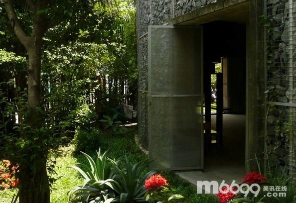 院子里的墻壁是粗糙石材建造的,由明顯的鋼網固定。這里生長有大量的這個國家特有的樹木和花草。還有休息用的木質結構??民間風格的長凳,而進入RockOffice內部空間的入口在小木屋的入口下面。這間迷你雨林辦公室的總面積為40平米左右。