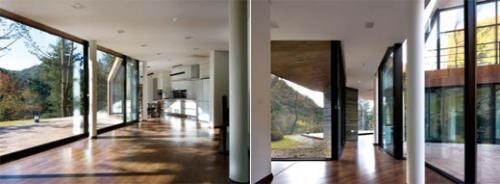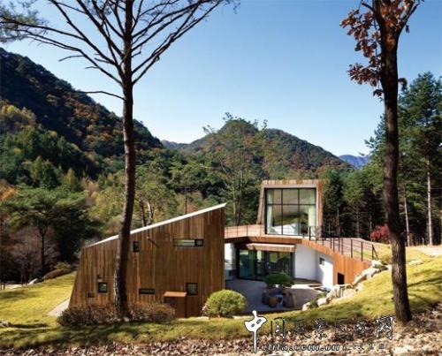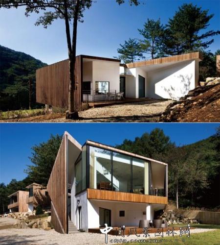 經(jīng)過兩年的建設(shè),五棟別墅在2010年下半年建成了,最終每棟別墅只是由1個主客廳、1個主臥室、1個小臥室、1個書房和1個廚房組成,外立面由未經(jīng)漆染且天然防腐的美國紅木構(gòu)造,自然古樸,隨著時間的流逝還將會變成淡淡的灰色;大面積的各個朝向的玻璃窗讓居者的視線可以自由無礙,隨時與周邊的山林風(fēng)景親密接觸。