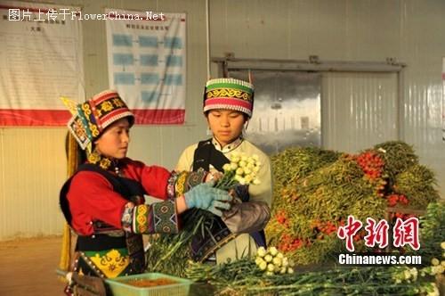 石林錦苑花卉產業園通過技術合作和自主研發,成功研發了凌波仙子、月光、鄉戀等23個植物新品種,成為中國目前擁有鮮切花自主知識產權新品種最多的單位。圖為昆明石林錦苑花卉產業園工作人員包裝整理康乃馨。