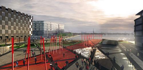 由劇院延伸出的“紅地毯”碼頭,穿過草地和植被組成的棋盤。紅地毯是由紅色的樹脂玻璃和紅色植被組成的。由多邊形綠植所組成的地毯,提供了足夠的座椅,穿過廣場,連接新建的飯店和辦公開發區域。以沼地植物為特色的植栽柔化了空間,并喚起場地原先作為沼澤地存在的回憶。多彩和多樣的空間將作為新建筑的場地。